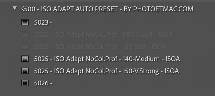 • appliquer un Preset AUTO : sur un groupe d’images de valeurs ISO différentes. Ce qui ajuste automatiquement les 10 Paramètres en un seul clic, sur toutes les images sélectionnées (spécifiquement en fonction de la valeur ISO de chaque image).