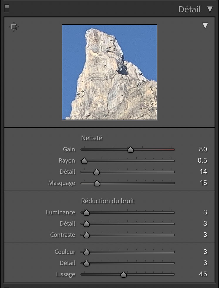 5 – Comment évaluer la qualité de l’accentuation et de la correction de bruit ? :  ayant formé des professionnels à Lightroom Classic depuis 2006 : j’ai remarqué que la plupart des photographes sont bien trop “timides” dans leurs réglages d’accentuation (ajout de netteté).