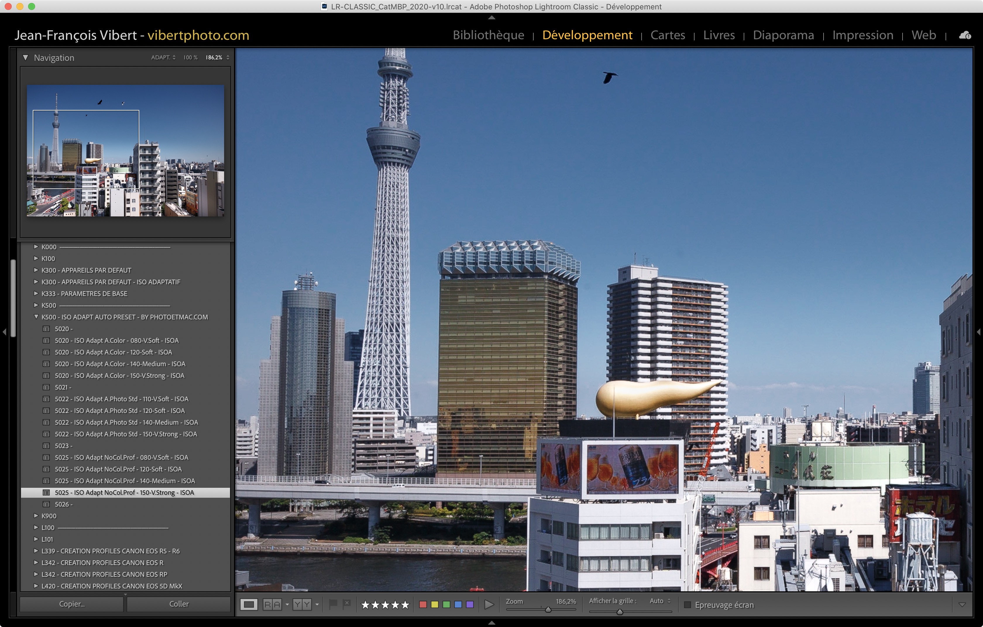 5e – Comparatif : Aucune Correction  /  V.Strong  : ici une image RAW de 50 Mpix du Canon EOS 5D Rs (modèle de 2015)… Observez sur cette image les très fines structures métalliques de la tour de gauche. Ainsi que les rideaux des fenêtres du bâtiment du centre : au premier plan. Sur ce type d’images de paysage, de voyage, ou de nature : le Preset “V.Strong” m’est extrêmement utile : un atout précieux pour accélérer mon flux de travail…