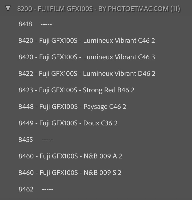 Les profils apparaissent dans un dossier : “BY PHOTOETMAC”… Vous pouvez installer les autres fichiers (8418, etc…) qui sont facultatifs. Ils servent juste de “séparateurs visuels” pour améliorer la lisibilité.