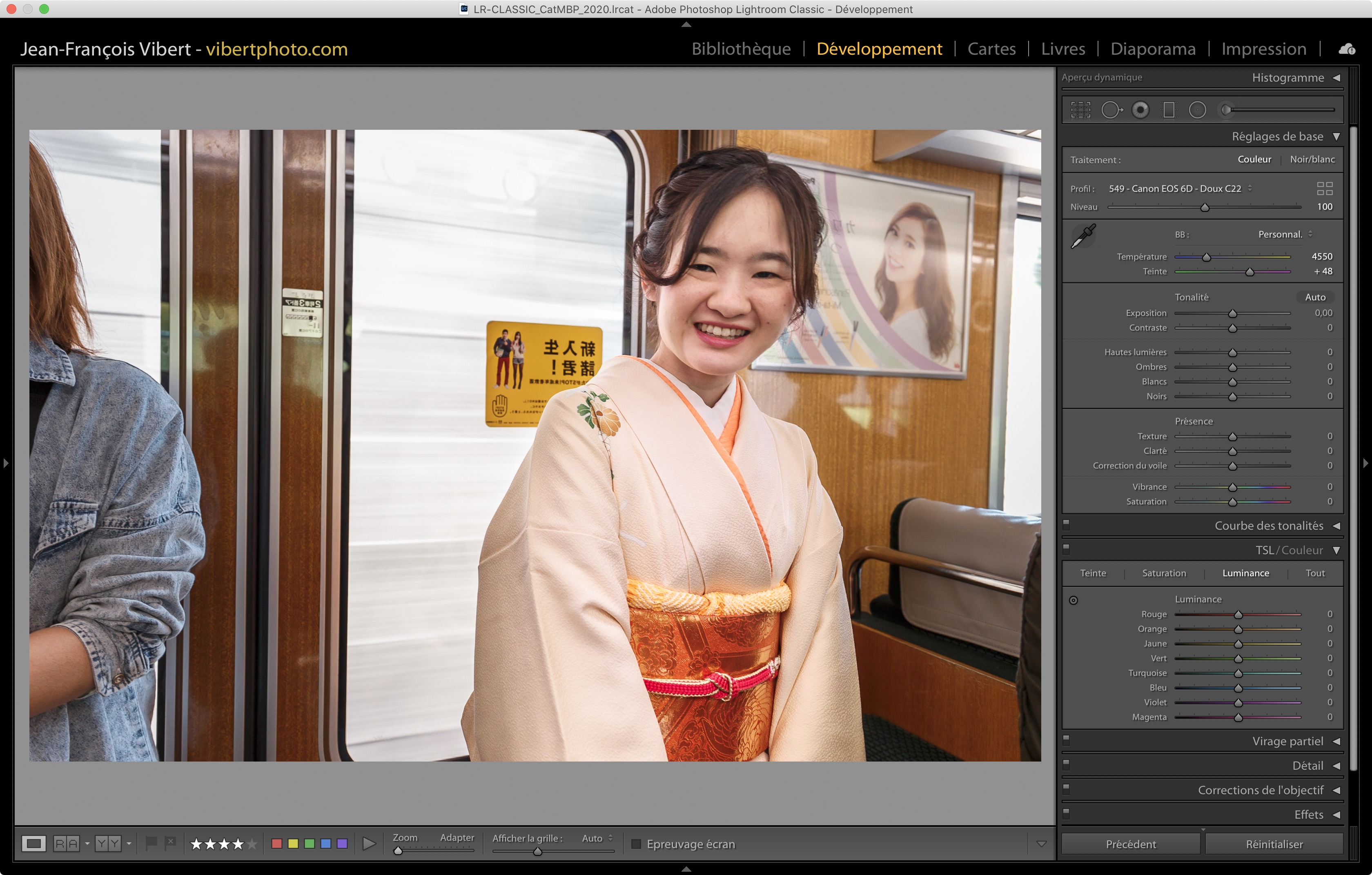Il est assez bien adapté au portrait en lumière naturelle et au flash… Mais en portrait, je recommande de conserver votre curseur de balance des blancs assez froide : entre 4900 et 5200 K (réglage par défaut de Lumière du Jour chez Canon est de 5150 K à 5200 K), sinon, les visages deviennent trop orange.